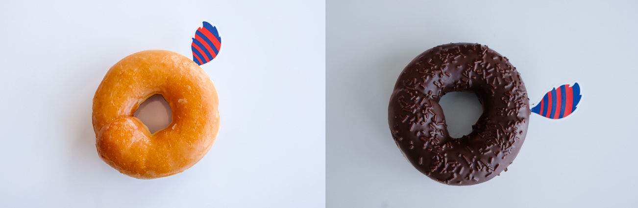 Based on fluffy and chewy fresh donuts, available in two varieties: plain with sugar glaze, and choco & choco topped with chocolate and chocolate sprinkles. This is a perfect item where the fluffy, chewy, and fragrant donut dough blends exquisitely with the sweetness of sugar and chocolate!