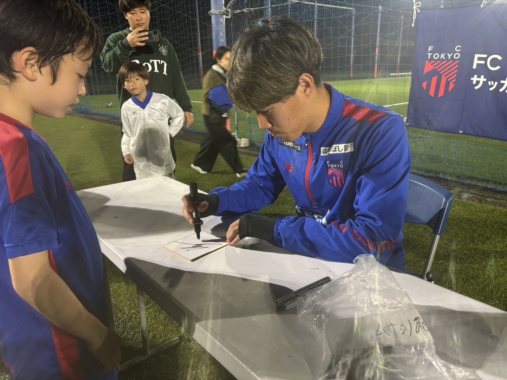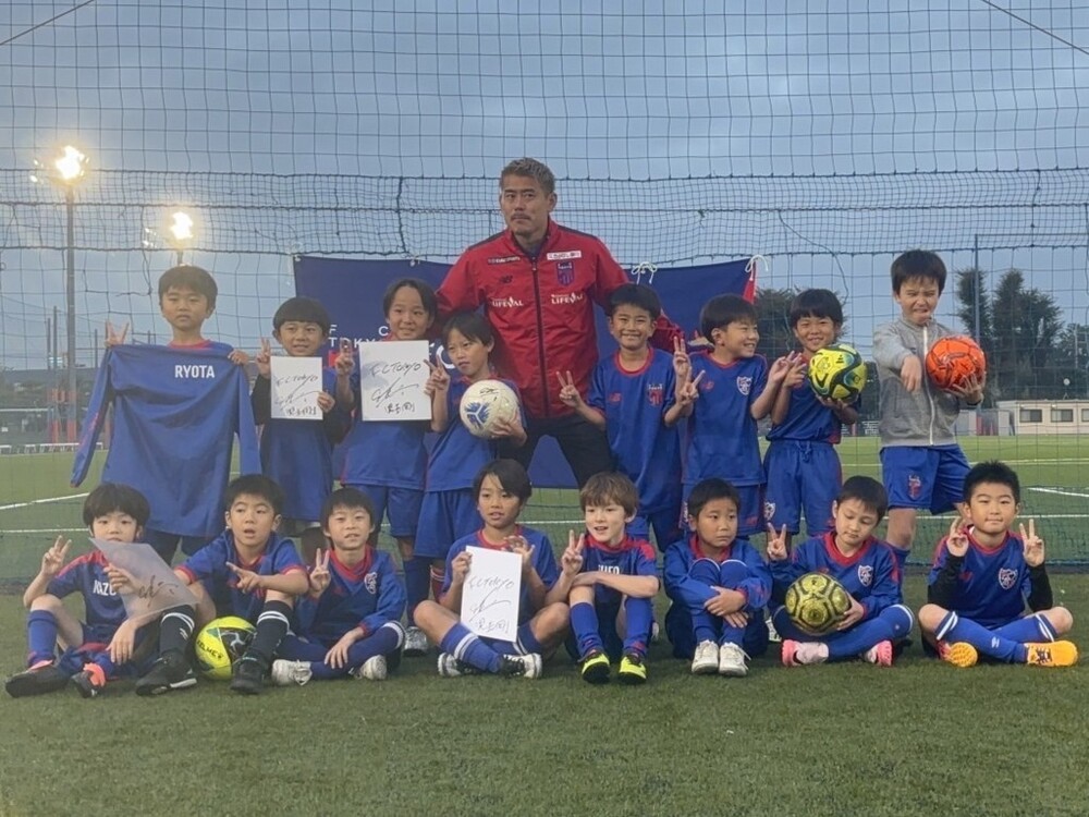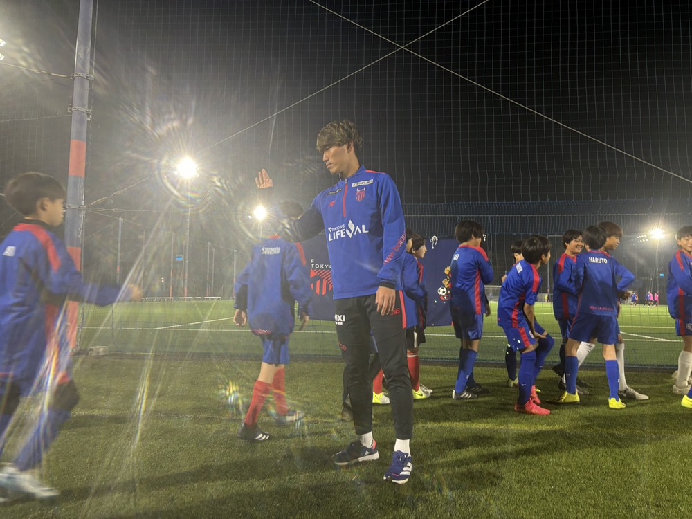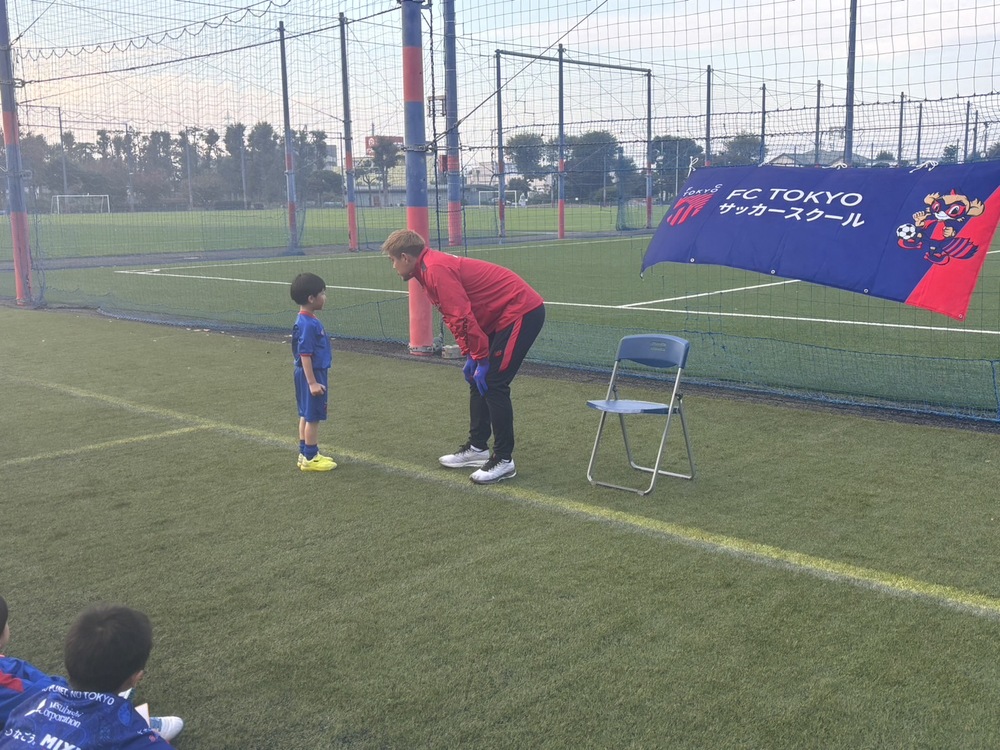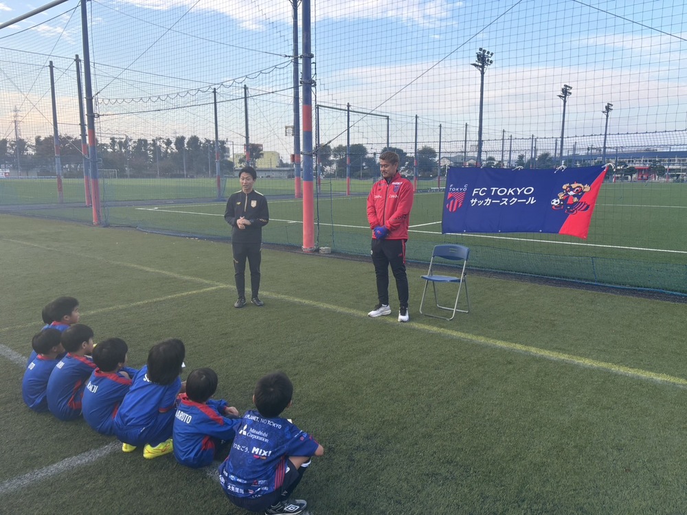 In response to the question from a student, "How can I kick the ball powerfully?" I explained that it is important to kick the center of the ball. Practicing juggling is also one of the training methods.