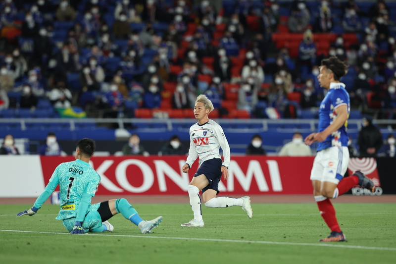 ハイプレス、ショートカウンター、ボール保持という似たスタイルを持つチーム同士、お互いの持ち味を存分に発揮する展開になった。立ち上がりは横浜FMの勢いに押される展開が続くように思えたが、東京は細かいパスワークからワイドな展開で相手を揺さぶる。起点になった右ウイングの紺野和也選手がサイドチェンジを多用し、左ウイングのアダイウトン選手を使って横浜FMゴールへと迫った。ともにペナルティエリア付近までボールを運ぶ中で、東京が先制を許す。前半8分、右サイドの深い位置からクロスボールを入れられると、ゴール前でマークを捕まえきれず、西村拓真選手にヘディングで合わされた。