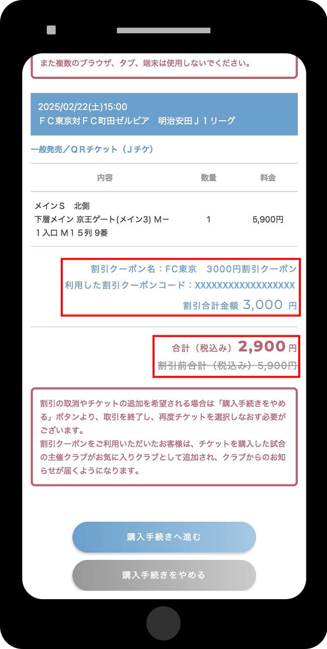 マイページに記載されている割引クーポンコードにて、チケットFC東京で観戦チケットをご購入の際にご利用いただくことで対象の金額が割引(またはご招待)となります。