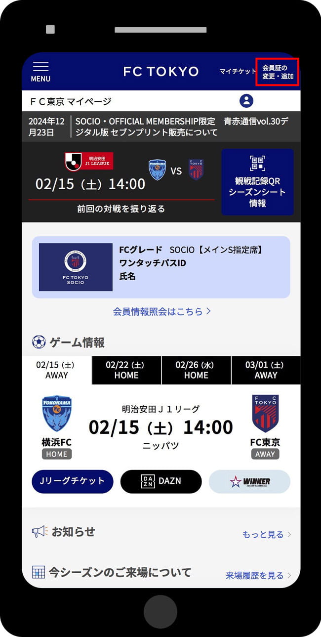 SOCIO・OFFICIAL MEMBERSHIPの両方が連携されている場合、デフォルト表示されている会員のお知らせが表示されます。