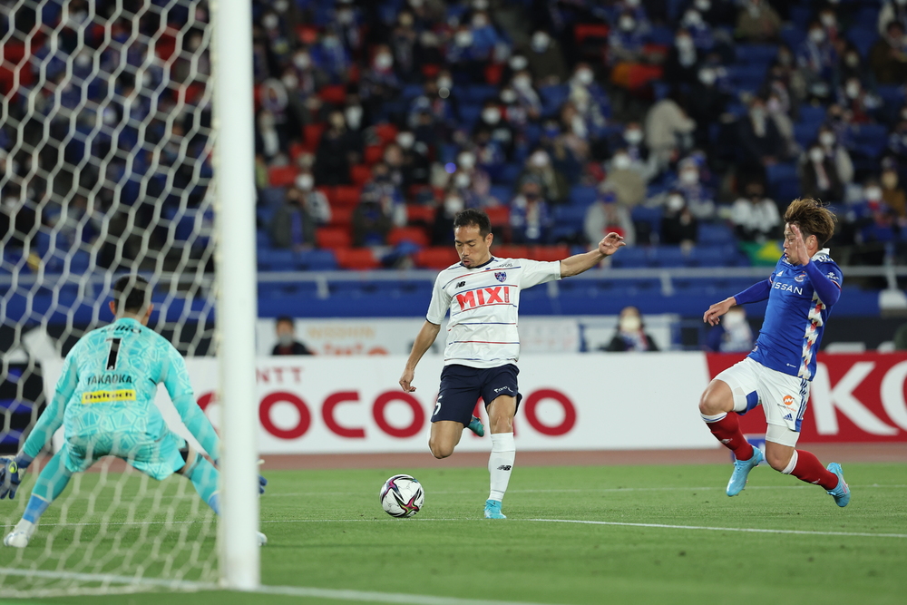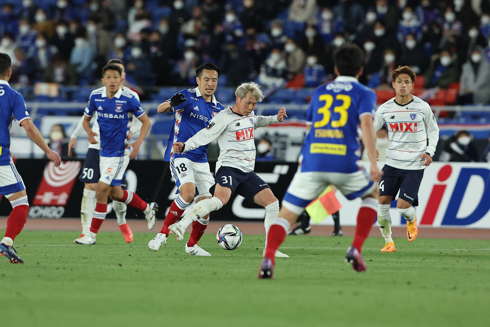前半中盤あたりから相手にボールを保持される時間が続く中で、東京はハイプレスの手を緩めずにチャンスを作り出す。前半21分には、相手がディフェンス間でパスをするところに紺野選手が猛プレスを仕掛けてボールカット。ゴールキーパーとの1対1でのシュートは止められ、セカンドボールをディエゴ選手、さらにアダイウトン選手も詰めていったが3度続いたシュートも粘る横浜FM守備陣にブロックされる。前半33分にはハーフライン付近左寄りの位置で安部選手がボールを奪うと、ディエゴ選手が前線へと運ぶ。逆サイドの紺野選手までボールを動かし、紺野選手が得意なエリアから左足のシュートを放ったが、ゴールのわずか左上へ。そのゴールキックのクイックスタートを松木選手が狙って奪うとすぐさまシュートへと持ち込むが、これはゴール右へと外れた。