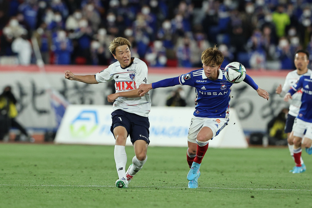ハイプレス、ショートカウンター、ボール保持という似たスタイルを持つチーム同士、お互いの持ち味を存分に発揮する展開になった。立ち上がりは横浜FMの勢いに押される展開が続くように思えたが、東京は細かいパスワークからワイドな展開で相手を揺さぶる。起点になった右ウイングの紺野和也選手がサイドチェンジを多用し、左ウイングのアダイウトン選手を使って横浜FMゴールへと迫った。ともにペナルティエリア付近までボールを運ぶ中で、東京が先制を許す。前半8分、右サイドの深い位置からクロスボールを入れられると、ゴール前でマークを捕まえきれず、西村拓真選手にヘディングで合わされた。