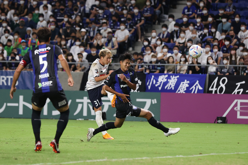 アディショナルタイムに入り、90分+3分。中盤でレアンドロ選手から右サイドに走る紺野選手へパスが入る。紺野選手はそのまま中央にドリブルで侵入し、左足を振り抜く。シュートは相手DF陣に当たり、ボールは空中に。落下点にいた渡邊選手がダイレクトボレーを打ったが、これはガンバGK東口選手の胸元に収まった。