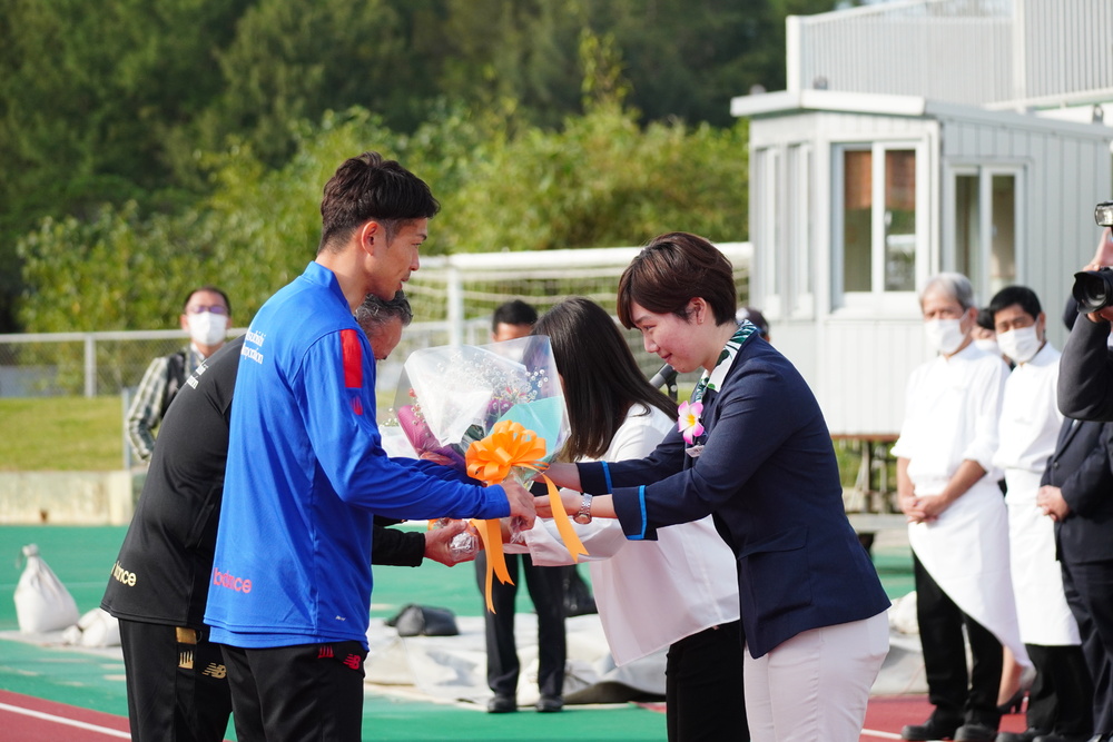 国頭村知花村長からの激励の言葉をいただいた後、チームを代表してアルベル監督から挨拶を行い、関係者のみなさまから贈呈品をいただきました。