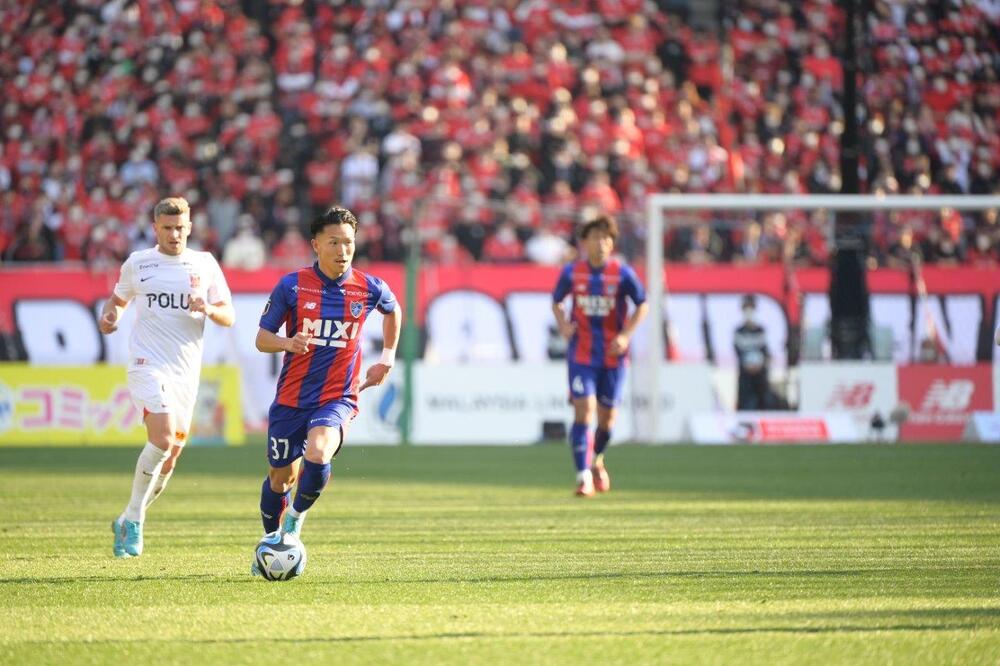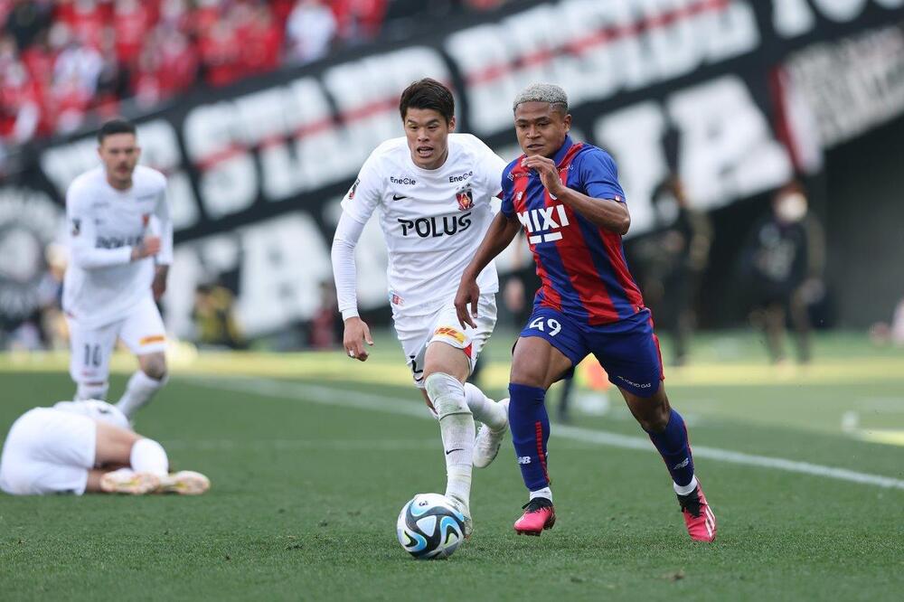 立ち上がりから強度が高く、激しい競り合いが続く。特に浦和が前線から厳しいプレスをかけてくるが、東京は流動的にポジションを変えながらボールを保持。相手をいなしながらボールを高い位置まで運んでいく。