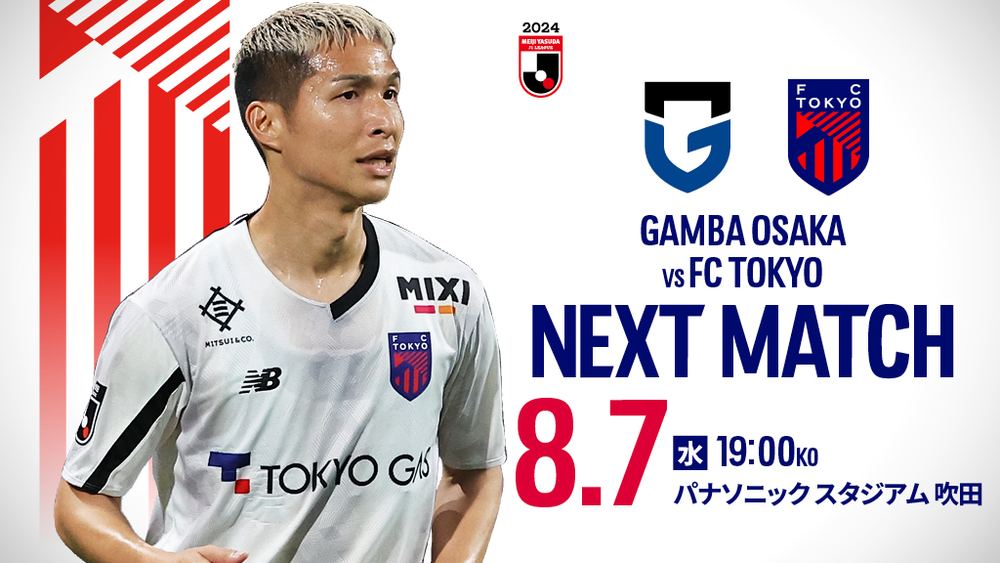 감바 오사카는 이번 승리로 기세를 타며 연승 가도를 달렸고, 중단 기간 돌입 시점에서 선두와 승점 5점 차 2위로 올라섰다. 6월의 메이지 야스다 J리그 KONAMI 월간 MVP에도 선정되었으며, 공격에 변화를 주는 우사미 타카시 선수는 누적 경고로 출전 정지 상태지만, 강력한 돌파와 스피드를 겸비한 에베르통 선수와 전황에 맞춘 정확한 패스를 장점으로 하는 스즈키 토쿠마 선수 등 도쿄로서도 반드시 막아야 할 선수가 다수 소속되어 있다.