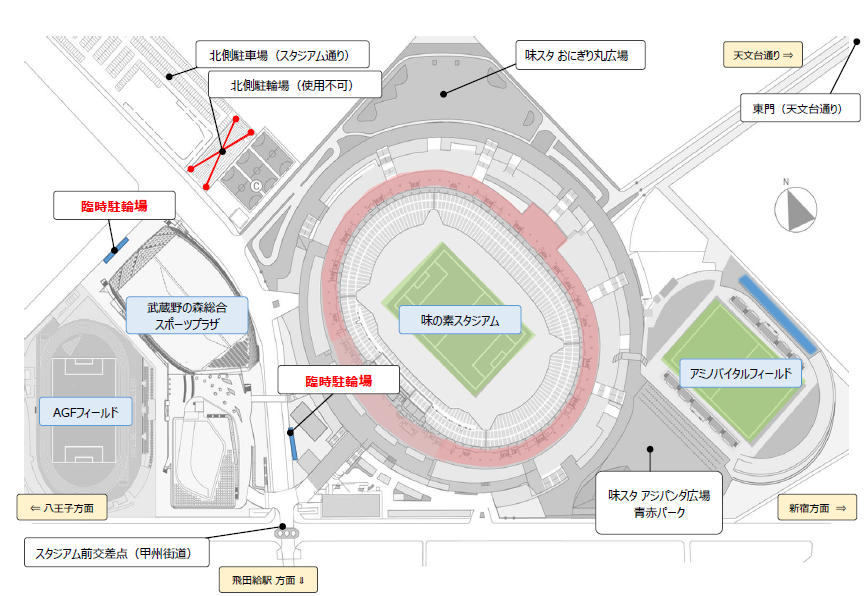 7월 15일(월 공휴일)부터 아지노모토 스타디움 북쪽 자전거 주차장 및 오토바이 전용 주차장이 공사로 인해 이용할 수 없게 됩니다.