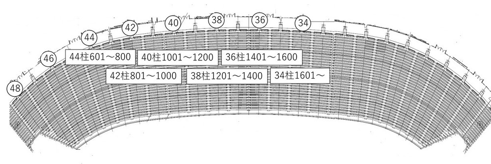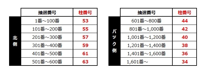 ・스탠드 내에 추첨 번호 순서대로 좌석 구역(기둥 번호 참조)을 설정하고 있습니다. 본인의 추첨 번호를 확인하신 후, 구역 내에서 기다려 주시기 바랍니다. ※원칙적으로 100번 단위로 1블록이 됩니다.