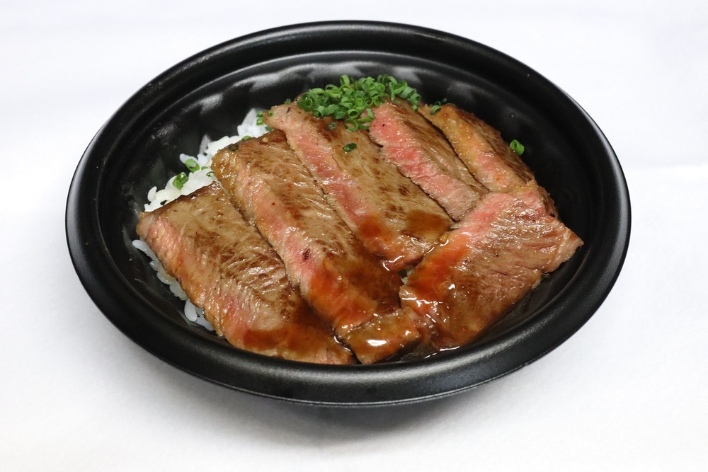 「고기 전문점이 만드는 ‘스테이크 덮밥’. 부드럽고 진한 맛이 특징인 소 어깨 등심을 사용하고 있습니다」