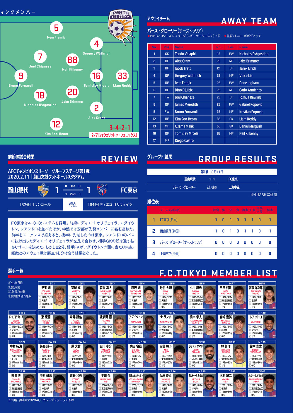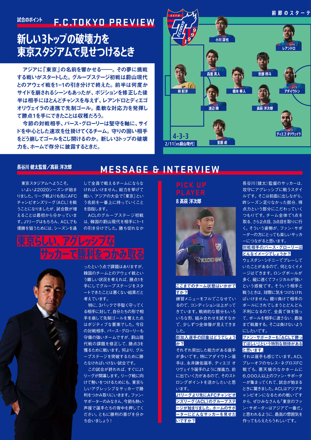 2/18(화) AFC 챔피언스리그 2020 그룹 스테이지 2차전 vs 퍼스 글로리(19:00 킥오프/도쿄 스타디움) 공식 매치데이 프로그램에 대해 아래와 같이 안내드립니다.