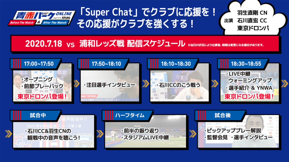 FC 도쿄에서는 STAY WITH TOKYO 정책의 일환으로 J1 리그 경기 전후에 YouTube【FC 도쿄 공식 채널】에서 LIVE 방송 기획 『아오아카 파크 온라인 Before The Match/After The Match supported by XFLAG』를 개최합니다.