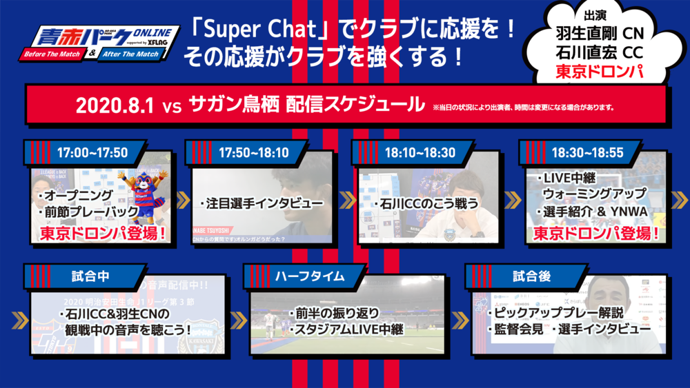 FC 도쿄에서는 STAY WITH TOKYO 정책의 일환으로 J1 리그 경기 전후에 YouTube【FC 도쿄 공식 채널】에서 LIVE 방송 기획 『아오아카 파크 온라인 Before The Match/After The Match supported by XFLAG』를 개최합니다.