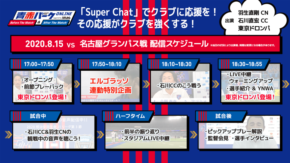 FC 도쿄에서는 STAY WITH TOKYO 정책의 일환으로 J1 리그 경기 전후에 YouTube【FC 도쿄 공식 채널】에서 LIVE 방송 기획 『아오아카 파크 온라인 Before The Match/After The Match supported by XFLAG』를 개최합니다.