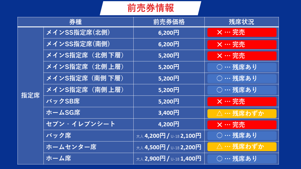 메인 SS석, 메인 S 지정석 북측 하층, 백 SB석, 세븐일레븐 시트는 판매가 종료되었습니다.