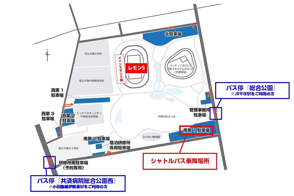 종합공원 주변에는 주차장이 없으니 JR 히라츠카역 주변 주차장을 이용하시고 버스를 이용해 주시기 바랍니다.