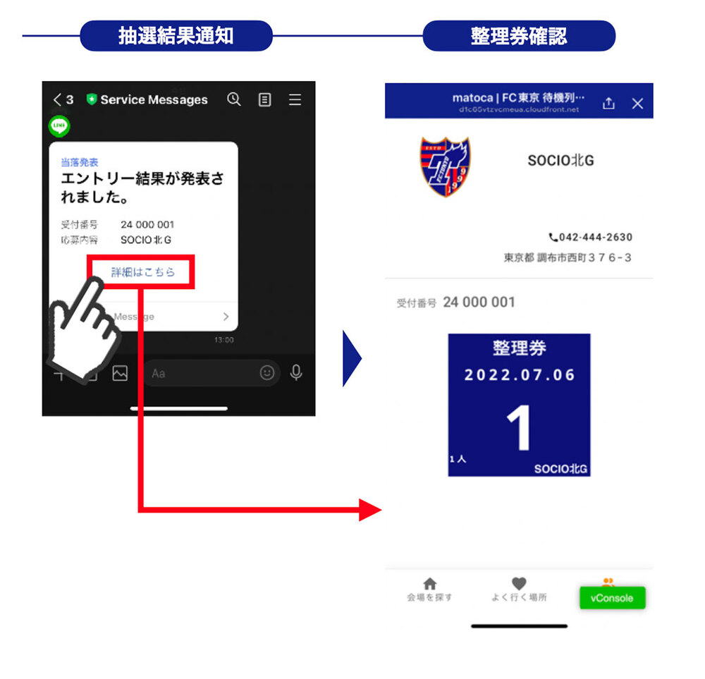 ・추첨 번호 배포 일시가 지나면 순차적으로 입장 정리권이 LINE(Service Messages)를 통해 전달됩니다.