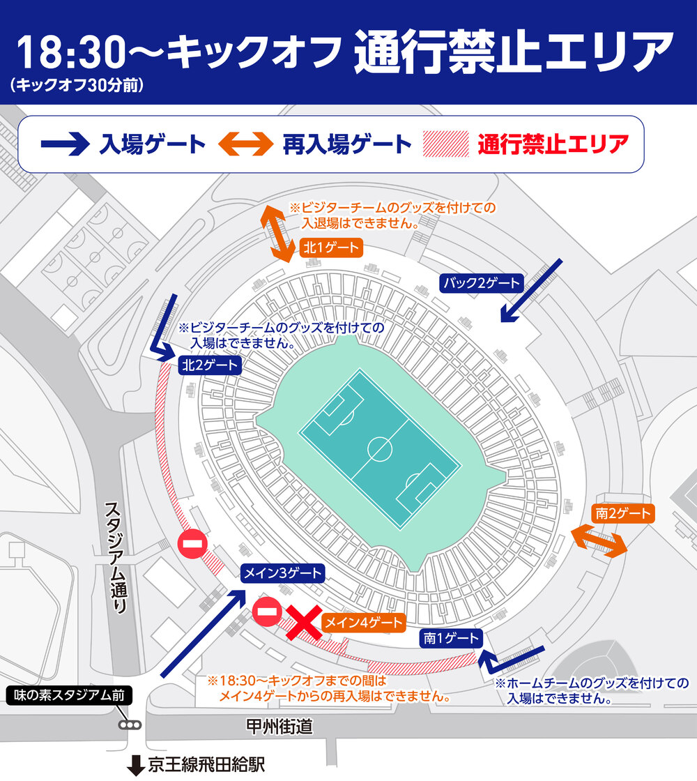 18:30부터 킥오프까지의 시간대에 메인 측 외부 콘코스 통행 금지를 실시합니다.