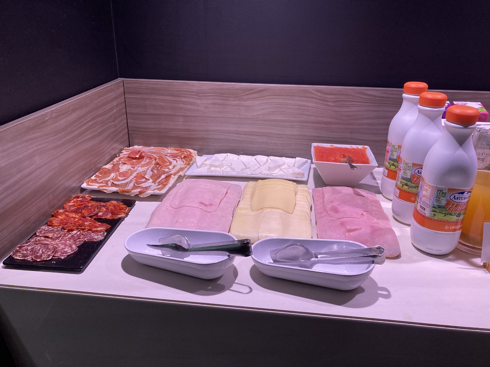 산세바스티안 호텔의 아침 식사 일부. 고급 햄이 일상적으로 식사에 제공됩니다.