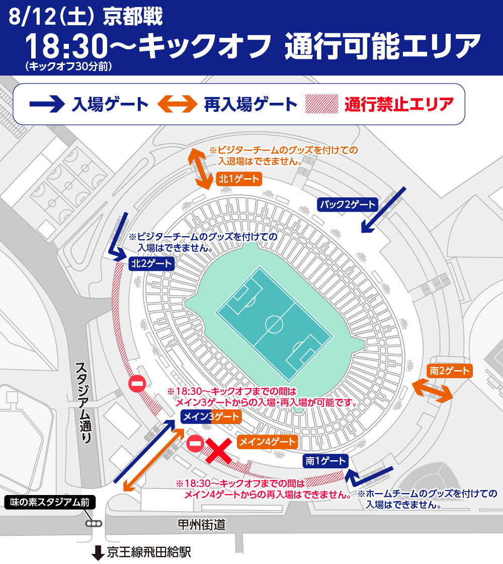 상기 통행 규제에 따라 19:30부터 20:15(하프타임 종료)까지 메인 4 게이트에서의 재입장은 불가능합니다. 또한, 불꽃놀이 실시 시에는 종일 재입장 게이트가 평소 게이트와 다르니 주의해 주시기 바랍니다.