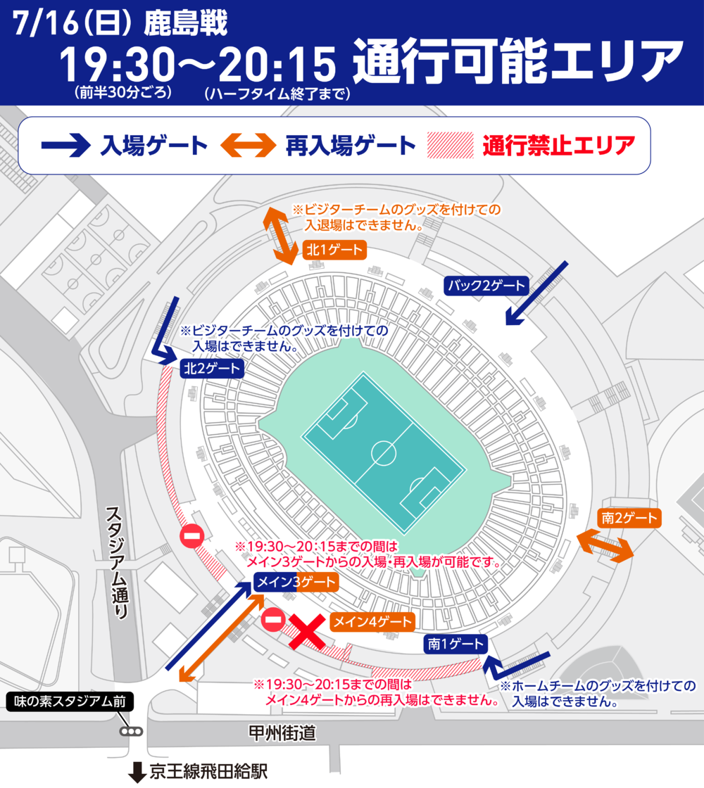 19:30부터 20:15(하프타임 종료)까지의 시간대에 메인 측 외부 콘코스의 통행 규제를 실시합니다.