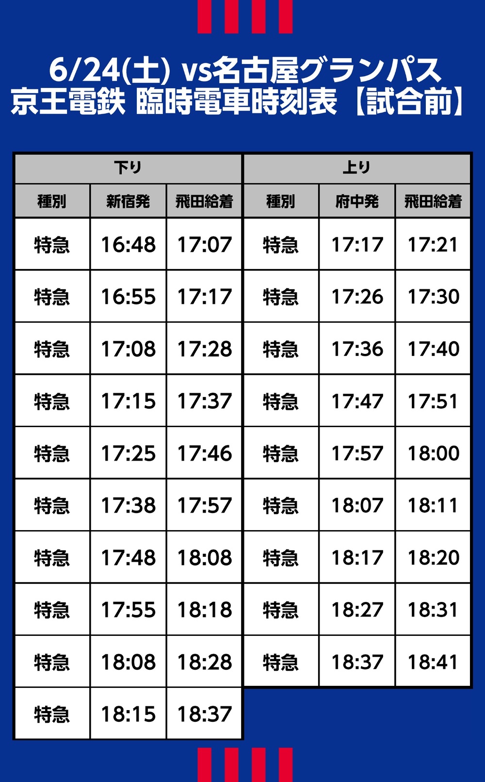 6월 24일(토) 2023 메이지 야스다 생명 J1 리그 제18절 vs 나고야 그램퍼스(19:00 킥오프/아지노모토 스타디움)에서 운행되는 임시 교통 접근(철도), 셔틀버스·노선버스에 대해 안내드립니다.