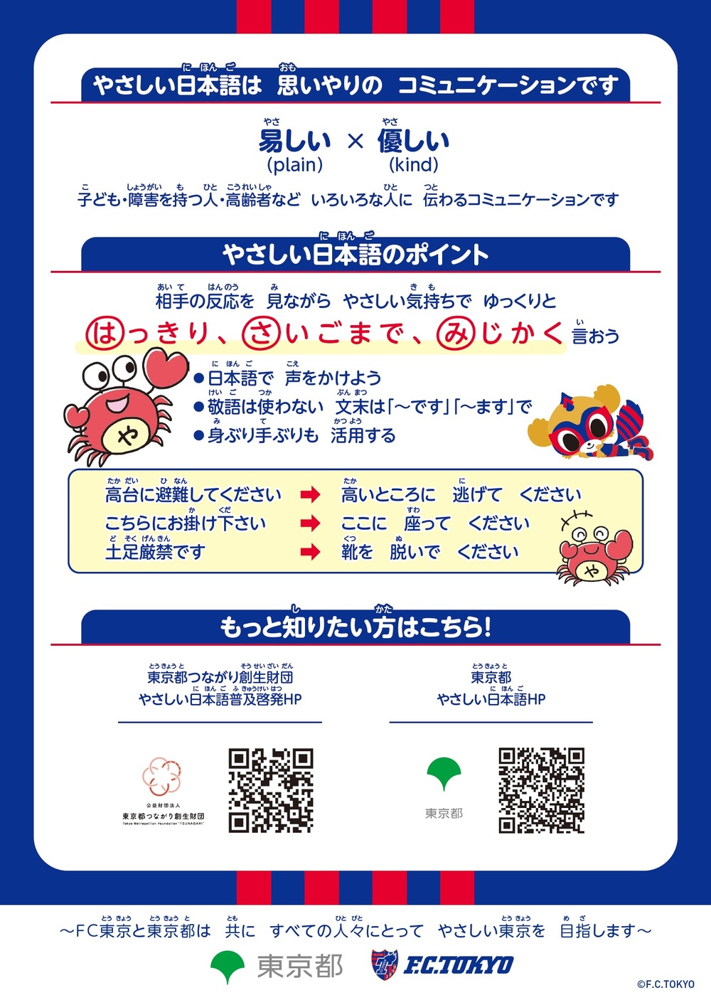 많은 분들께서 「쉬운 일본어」를 알게 되시고, 외국인이나 장애 유무에 관계없이 모두가 살기 편한, 친절한 도쿄를 목표로 합시다.