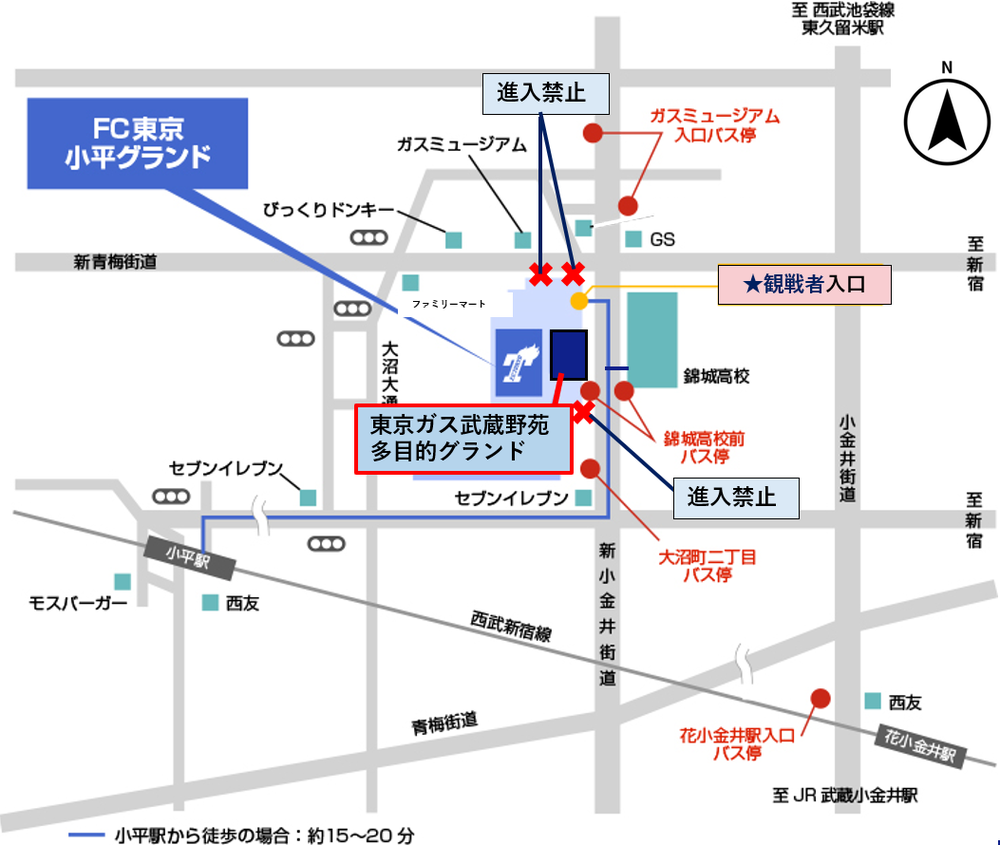 JR 주오선 ‘무사시코가네이역’ 하차, 세이부 버스(21번 노선 히가시쿠루메행) ‘긴죠 고등학교 앞’ 하차, 도보 1분