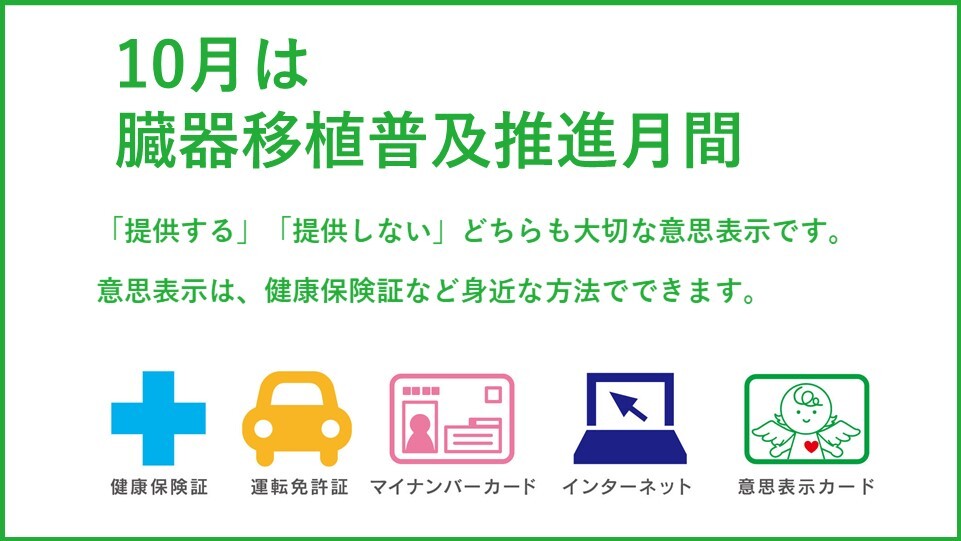 현재 국내에서 장기 이식을 기다리고 있는 사람은 약 16,000명입니다. 그 중 이식을 받을 수 있는 사람은 아직 겨우 3%에 불과합니다. 장기 이식이란, 중병이나 사고 등으로 장기 기능이 저하된 사람에게, 돌아가신 분의 아직 건강한 장기를 이식하여 기능을 회복시키는 의료입니다. 선의에 의한 장기 제공 없이는 성립할 수 없습니다. 장기 제공 의사는 건강보험증, 운전면허증, 마이넘버 카드, 의사 표시 카드, 인터넷에서 표시할 수 있습니다. 「YES」든 「NO」든 장기 제공에 관한 의사 표시 협조를 부탁드립니다.