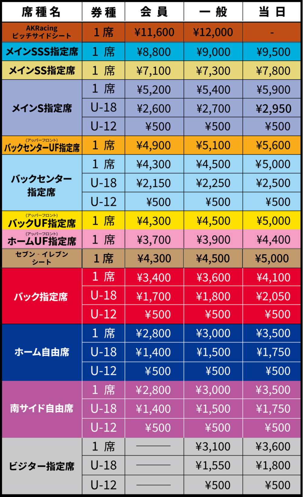 ※U-18 요금은 2006년 4월 2일 이후 출생자, U-12 요금은 2012년 4월 2일 이후 출생자가 대상입니다. 미취학 아동은 보호자의 무릎 위에서 관전하는 경우에 한해 티켓이 필요 없습니다