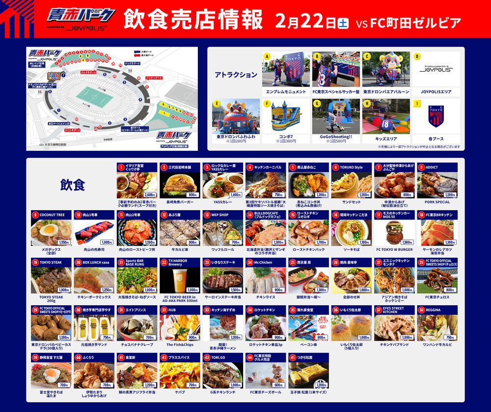2월 22일(토) 2025 메이지 야스다 생명 J1 리그 제2절 vs FC 마치다 젤비아(15:00 킥오프/아지노모토 스타디움)의 아오아카 파크 supported by JOYPOLIS (장외), 출장!! 아오아카 파크 supported by JOYPOLIS, 스타디움 내 콘코스(장내) 매점에서 판매하는 음식 정보를 알려드립니다.