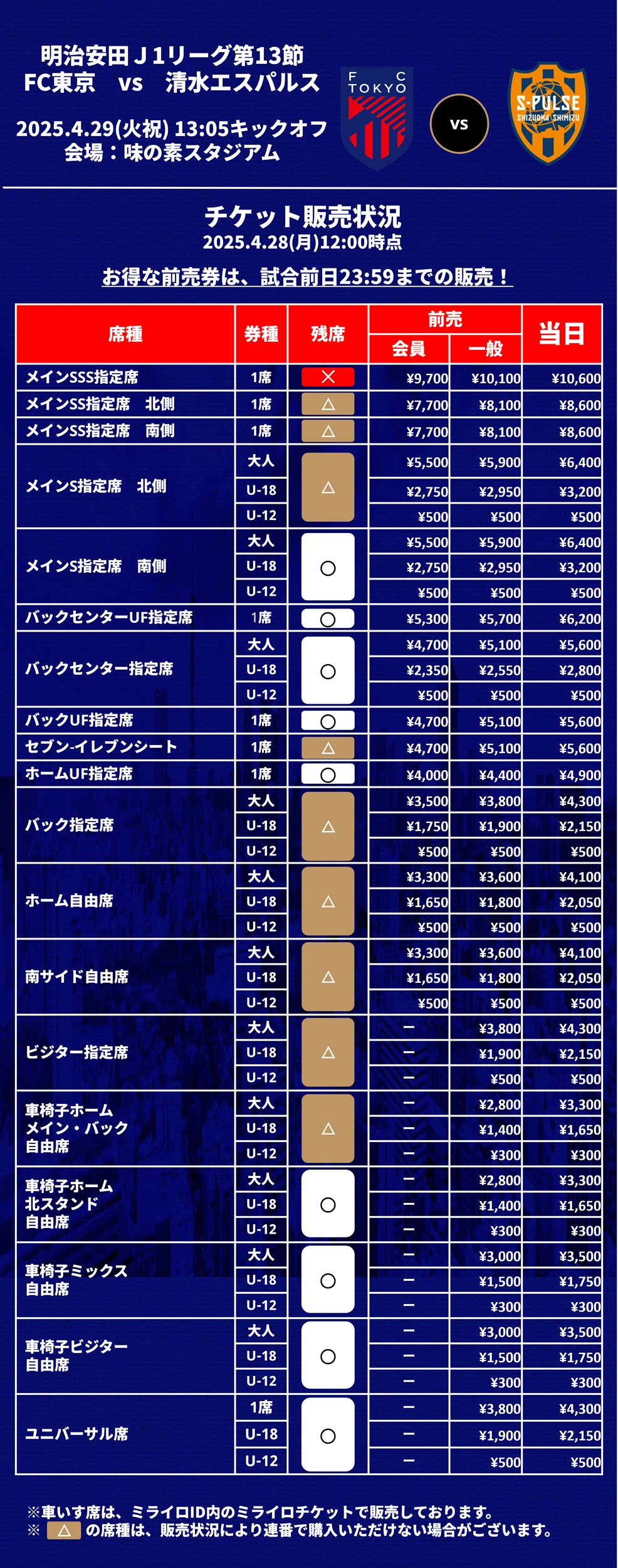 2025 메이지 야스다 J1리그 제13절 FC 도쿄 vs 시미즈 에스펄스(13:05 킥오프/아지노모토 스타디움) 당일권 판매에 관하여 아래와 같이 안내드립니다.