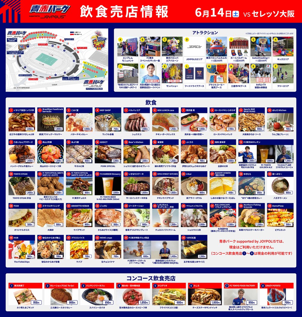 6월 14일(토) 2025 메이지야스다 J1리그 제20절 세레소 오사카(19:00 킥오프/아지노모토 스타디움)의 아오아카 파크 supported by JOYPOLIS (장외), 출장!! 아오아카 파크 supported by JOYPOLIS, 스타디움 내 콘코스(장내) 매장에서 판매하는 음식 및 음료 정보를 알려드립니다.