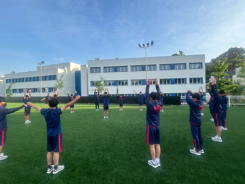 내일은 오전에 중학생으로서 본분인 공부를 합니다. 오후에는 아틀레티코 마드리드의 스타디움을 관광한 후, 아틀레티코 마드리드 아카데미와 연습 경기를 합니다.
