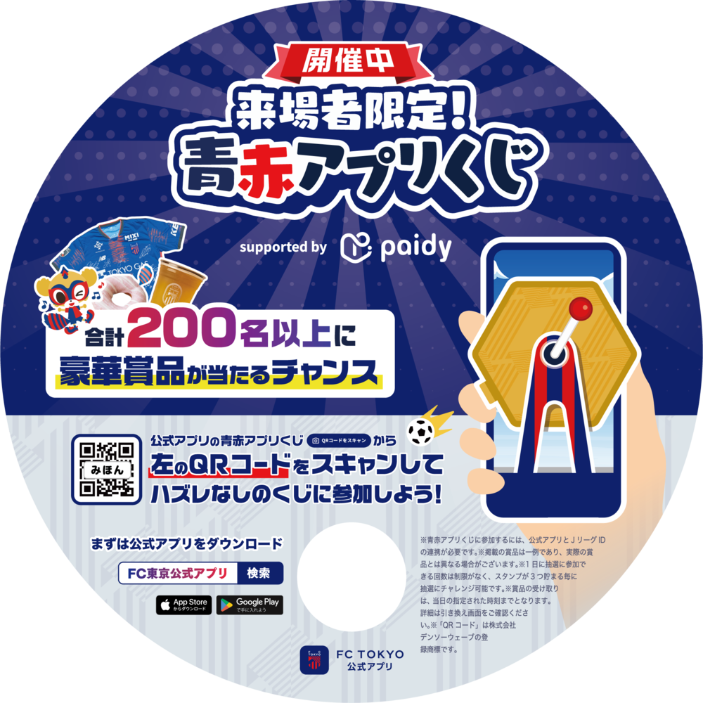 7월 19일(토) 2025 메이지 야스다 J1리그 제24절 vs 우라와 레즈(19:00 킥오프/아지노모토 스타디움)에서 FC 도쿄 공식 앱을 활용한 방문객 한정 『청적 앱 복권 supported by Paidy』 리뉴얼 캠페인 제1탄을 실시합니다.