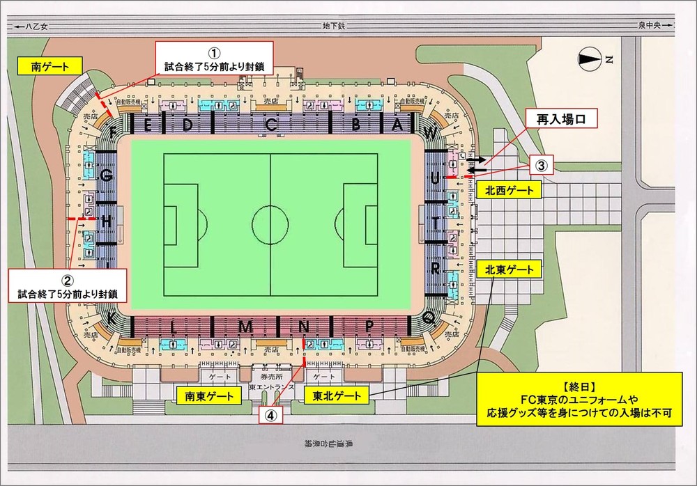 ※북동 게이트 및 동북 게이트에서는 FC 도쿄 유니폼이나 응원 굿즈 등을 착용하고 입장하는 것이 카테고리 프리 이후에도불가능합니다.
