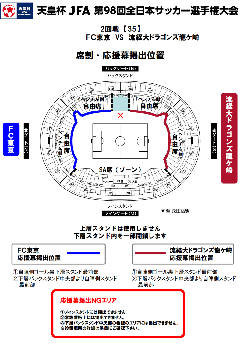 천황배 JFA 제98회 전일본 축구 선수권 대회 2회전 FC 도쿄 vs 류케이대 드래곤즈 류가사키 경기 운영을 담당하는 도쿄도 축구 협회로부터, 아래와 같이 경기 당일 개문 시간, 사용 스탠드, 응원 현수막, 관전 규칙 등에 관한 안내가 있어 알려드립니다.