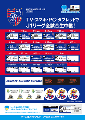 스카파!에서는 7/9(토) 2016 메이지 야스다 생명 J1 리그 2nd 스테이지 제2절 반포레 고후전이 열리는 아지노모토스타디움 내 콩코스에 「스카파!FC 도쿄 2nd 스테이지 스케줄 스티커」를 설치합니다. 수량이 한정되어 있으니 원칙적으로 1인당 1장씩 가져가셔서 달력이나 수첩에 붙여서 이용해 주시기 바랍니다.