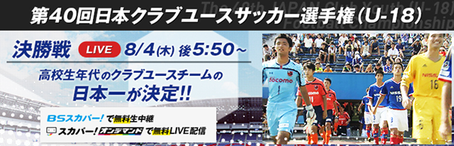 고등학생 연령대 클럽 유스 팀의 일본 최고를 결정하는 『일본 클럽 유스 축구 선수권(U-18) 대회』. 각 지역 예선을 통과한 32개 팀이 격돌하는 그룹 리그가 오늘 7/25(월)부터 시작되고 있습니다!스카파!에서는 8/4(목)에 열리는 결승전의 모습을 BS스카파!에서 무료 생중계,스카파! 온디맨드에서도 무료 LIVE 방송합니다!