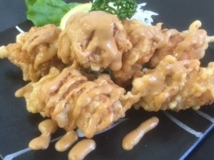 (10)아마카라 아게・・・700엔 여성을 위해 달콤하면서도 매콤한 소스를 스페셜 블렌드하여 센베이(쌀과자) 들어간 가라아게에 토핑했습니다. |