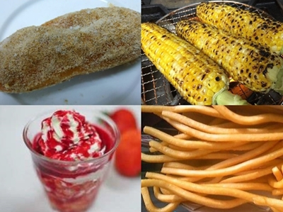 (7) 딸기 빙수, 스테이크 꼬치, 베이컨 꼬치, 프랑크푸르트, 감자튀김, 생맥주 등