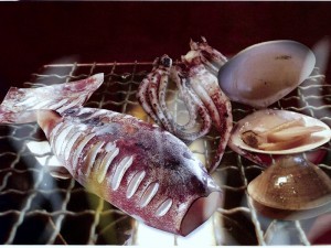 츠키지에서 구입한 오징어와 바지락을 숯불에 구웠습니다.