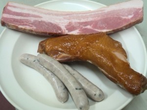 도쿄도 지역 특산품 인증 식품인 소금을 사용한, 스모크 베이컨과 스모크 치킨, 스모크 소시지를 구워낸 세트 메뉴입니다.