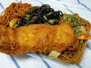 (3)핫트릭 야키소바・・・1,000엔 「히가시무라야마 흑야키소바」「히가시무라야마 적야키소바」「포장마차 야키소바」세 가지를 푸짐하게 합쳐서, 승리를 기원하는 꼬치카츠를 토핑했습니다. |