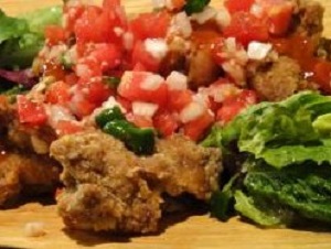 (8)살사 프라이드 치킨(포요 프리토)・・・600엔 멕시코에서는 "포요 프리토"라고 불리며 친숙한 프라이드 치킨입니다. 바삭하게 갓 튀긴 프라이드 치킨에 자랑하는 수제 멕시칸 살사 소스를 뿌려 더욱 맛있게 만들었습니다.