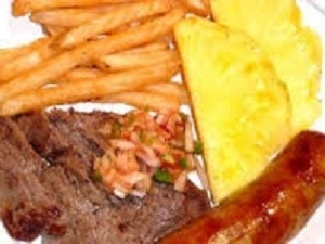 (7)슈하스코 플레이트・・・1,200엔 축구 왕국 브라질의 향토 요리 "슈하스코"를 자가제 드럼통으로 구운 절품 고기 요리입니다. 숨은 맛으로 "도쿄도 지역 특산품 인증 식품"으로 인정된 도쿄 이즈 오오시마 특산 소금을 사용하고 있습니다! |