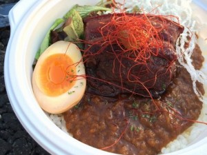 (8) 허브 삼원돈 껍질 붙은 각니 카레・・・1,300엔 허브가 들어간 사료로 키운 고급 삼원돈의 돼지 삼겹살을 껍질 채 부드러운 각니로 완성했습니다. 각니에는 「도쿄도 지역 특산품 인증 식품」으로 인정된 다마의 간장을 사용하여, 그 특별한 감칠맛을 만끽해 주세요!