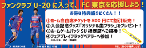 팬클럽 U-20 회원(연회비 1,000엔/1997년 1월 1일 이후 출생자)에게 당일권을 할인 판매합니다. 홈 경기(2017 메이지 야스다 생명 J1 리그전·르방컵) 전 경기의 홈 자유석(성인)을 800엔(통상 2,700엔)에 판매합니다. 20세 이하 분들은 필견!! 또한, 팬클럽 U-20 가입은 팬클럽 U-20 접수처(장외 메인·백) 및 회원 접수 텐트(장내 메인·백)에서 접수하고 있습니다. 꼭, 저렴한 관전으로 FC 도쿄를 많이 응원해 주세요.