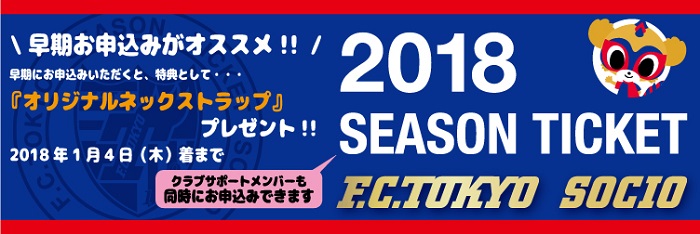 오늘 11/10(금)부터 2018 연간 티켓 신청 접수를 시작합니다. 꼭 연간 티켓을 구매하시고 스타디움에 방문해 주시기 바랍니다. 4만 8천 명 수용 가능한 아지노모토 스타디움을 SOCIO 여러분과 함께 "청적"으로 물들여 뜨거운 응원으로 선수들을 격려해 주세요. 함께 싸우며 승리의 기쁨을 나눕시다.