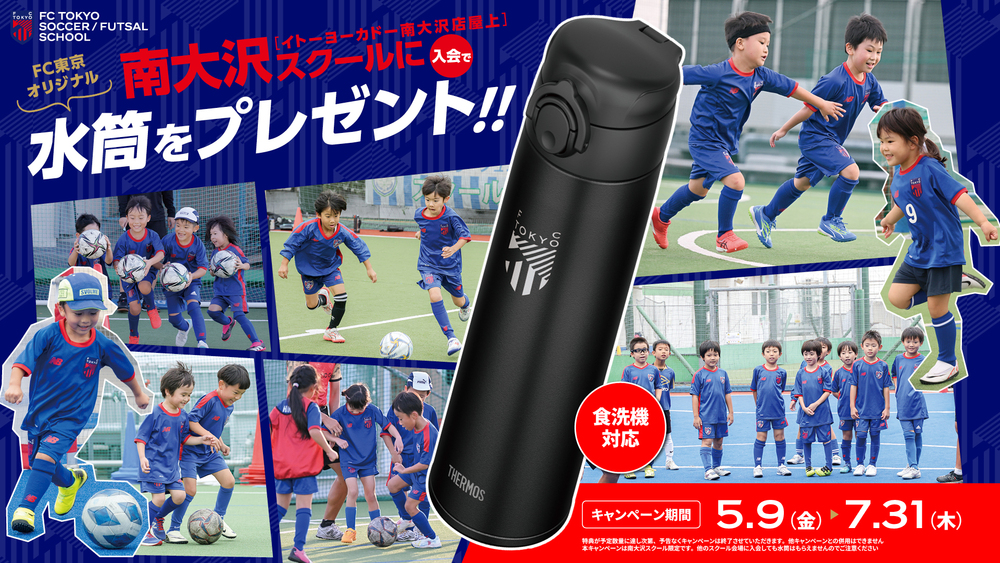 ※본 캠페인은 미나미오사와 스쿨에만 적용되므로, 다른 FC 도쿄 축구·풋살 스쿨에 입회해도 물통은 받을 수 없으니 주의해 주시기 바랍니다